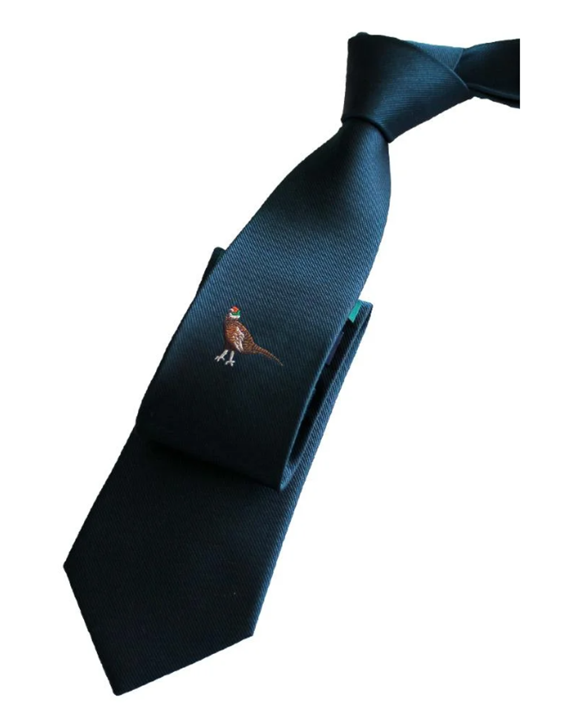 Crafted with precision and heritage in mind, this 100% silk tie features a detailed embroidered pheasant motif—an emblem of British countryside tradition. The rich palette and fine stitching lend understated distinction to formal attire, making it a refined choice for seasonal gatherings, country events, or distinguished everyday wear. Designed to complement classic tailoring while offering a subtle nod to rural elegance.